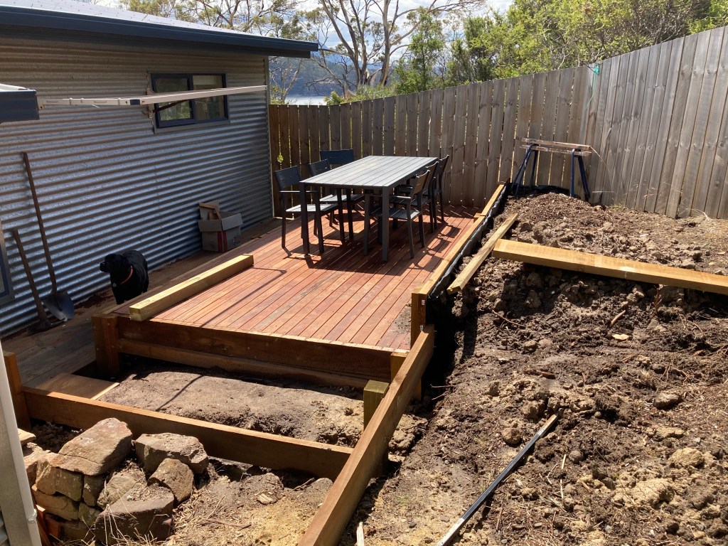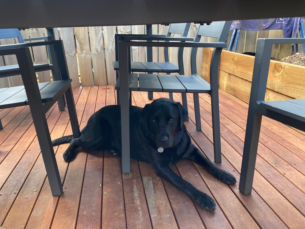 As a result, a plan to make the area less inhospitable was hatched. This has meant digging out the area just outside the back door for the purpose of a good-sized deck on which to locate our outdoor furniture. It has also meant that Number One Dog is now able to stretch out and do what she does best – snooze without the need for pitons, hammocks and ropes. Ruby has expressed great appreciation by taking up residence under the table.