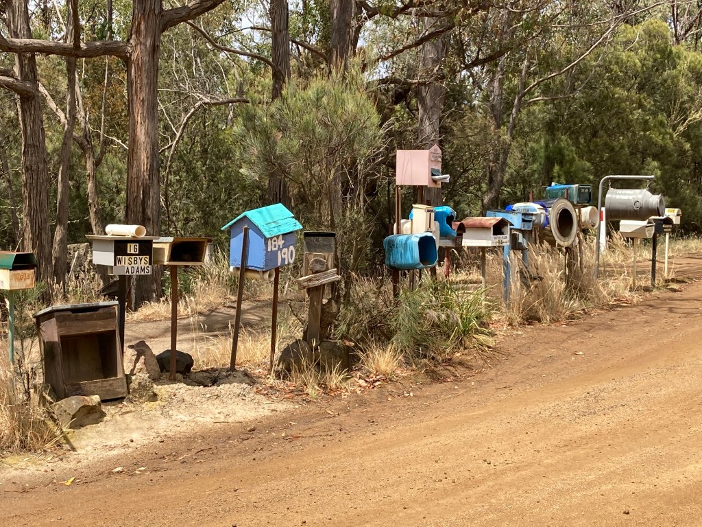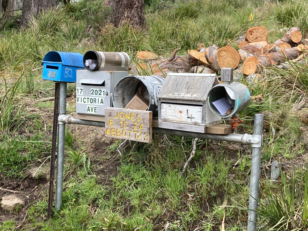 So began my observation of Bruny Island letterboxes which comprise lots of repurposing, various attempts for weather control ( heavy plastic curtain employed at # 88) interspersed with the odd commercially produced number. All letterboxes are located on one side of the main road, often in clusters to maximise delivery and to ensure that Shaun the Postie has easy access from the comfort of his distinctive white van ( music pumping from within). As we live on the Main Road for me mail collection is just a quick trip down the drive but for others it’s an excursion.