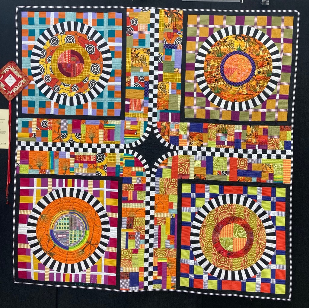 I decided to enter ‘Not the Levens Hall at all’, a quilt I started in a workshop at Bathurst with legend Marg Sampson-George in 2013. I had made the central medallions in the months following but then it was packed away until we moved to Bruny. There it was resurrected as adding the successive hexagons was perfect hand sewing to take to a CQ meeting. Once I got to the many borders I was on a roll and I finished it in 2023 a mere 10 years after I started it ( I love it when people ask me how long it takes to make a quilt!). I then sent it back to Orange and my amazing friend, Belinda Betts, to be quilted