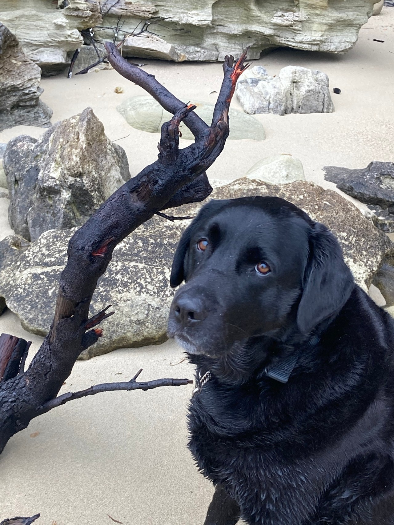 Perfect walk; firm sand, smooth seas for swmiming and lots of fresh smells plus so many of my friends are there. I get high on excitement but maintain a quiet, trustworthy composure which lures Mum into letting me off my lead to frolic in the shallows with Norman and do Zoomies with Coco. It is a happy gaggle of dogs and adults that hit the big rock and turn for home. I wait until we are several hundred yards along the beach when I make my move. By the time I hear the words ‘where’s Ruby?’ I am well away into the scrub. A search party comes after me – I won’t repeat the words I heard – but cunning moi hid from them all for a full 45 minutes until I allowed myself to be found – I was after all tired and a little hungry.